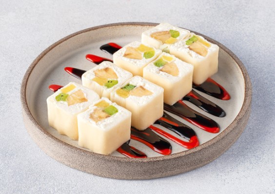 ананас, банан, киви, сливочный крем, спринг-тесто, топпинг клубничный, топпинг шоколадный.