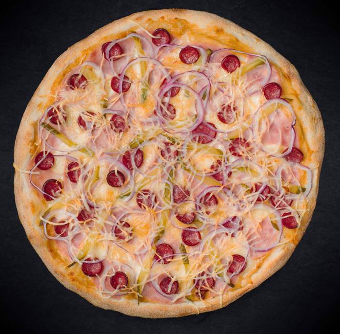 индейка, колбаски охотничьи, корнишоны, лук красный, моцарелла, соус горчичный, Сыр Пармезан (сырный борт).
