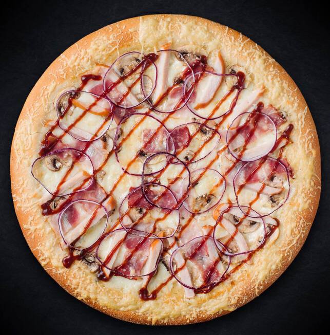 индейка, цыпленок копченый, шампиньоны, лук красный, моцарелла, пармезан, сливочно-чесночный соус, соус барбекю, Сыр Пармезан (сырный борт).