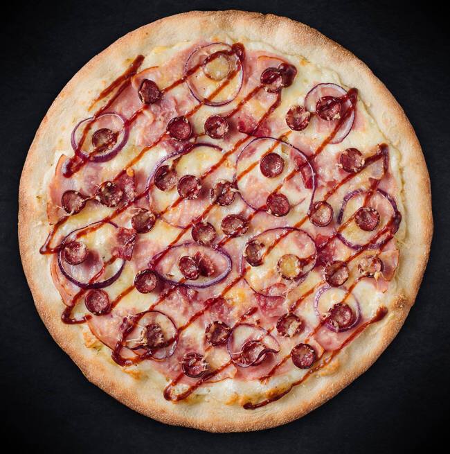 индейка, ветчина, колбаски охотничьи, лук красный, моцарелла, пармезан, сливочно-чесночный соус, соус барбекю, Сыр Пармезан (сырный борт).