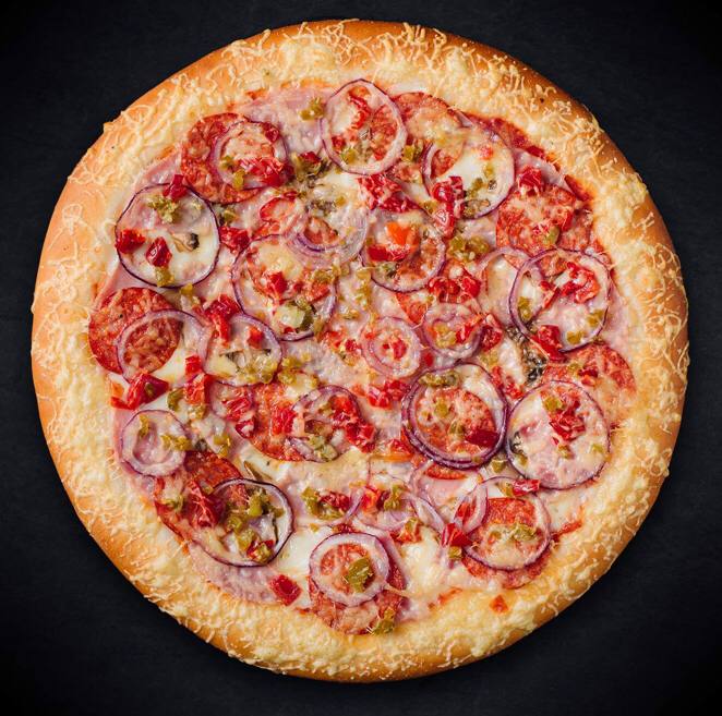 индейка, пепперони, шампиньоны, паприка маринованная, лук красный, халапеньо, моцарелла, пармезан, соус-пицца, Сыр Пармезан (сырный борт).