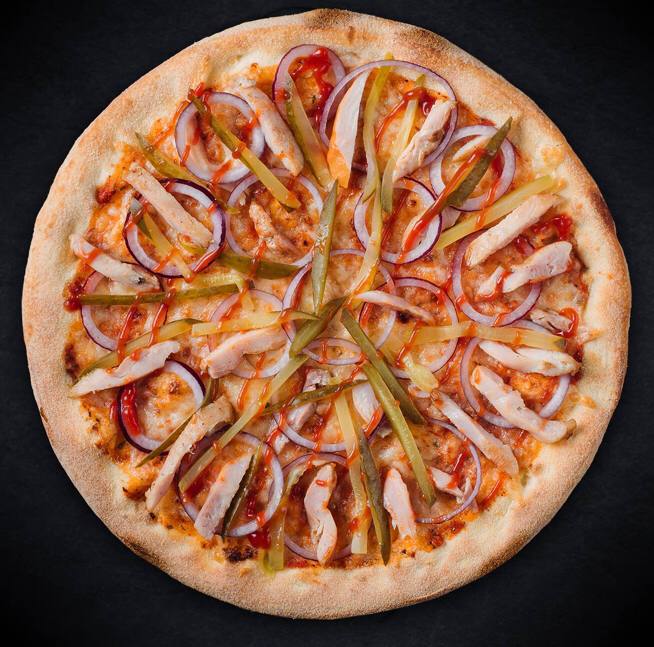 шашлык из бедра цыплёнка, корнишоны, лук красный, моцарелла, соус шашлычный, кетчуп, Сыр Пармезан (сырный борт).