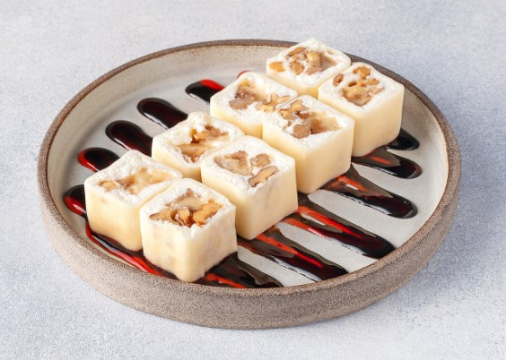 грецкий орех, банан, мёд, сливочный сыр, спринг-тесто, клубничный топпинг, шоколадный топпинг.
