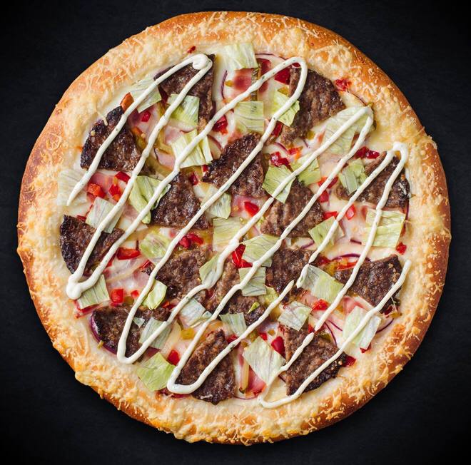 котлета говяжья, индейка, паприка маринованная, корнишоны, лук красный, халапеньо, моцарелла, айсберг, сливочно-чесночный соус, Сыр Пармезан (сырный борт).
