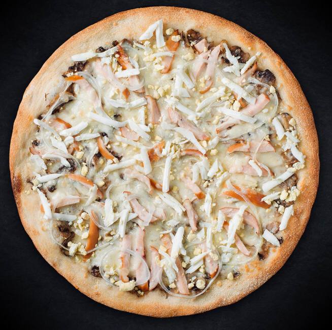 цыпленок копченый, яйцо, лук репчатый, моцарелла, соус грибной, Сыр Пармезан (сырный борт).