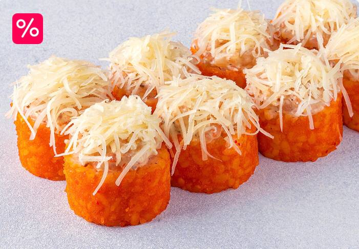 Лосось, краб-крем, омлет, сливочный сыр, сыр моцарелла огурец, масаго . 8шт.