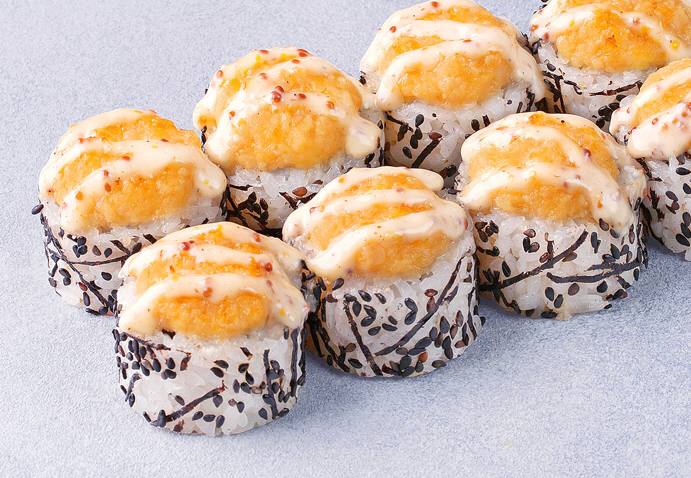 Цыплёнок, краб-крем, болгарский перец, салат айсберг, кунжут, сырный соус, шеф-соус. 8шт.