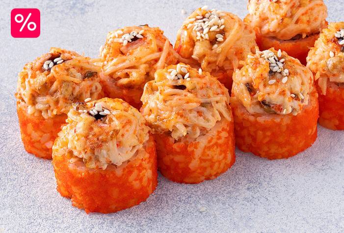Угорь, краб-крем, омлет, сливочный сыр, огурец, масаго, кунжут, яки соус, унаги соус. 8шт.
